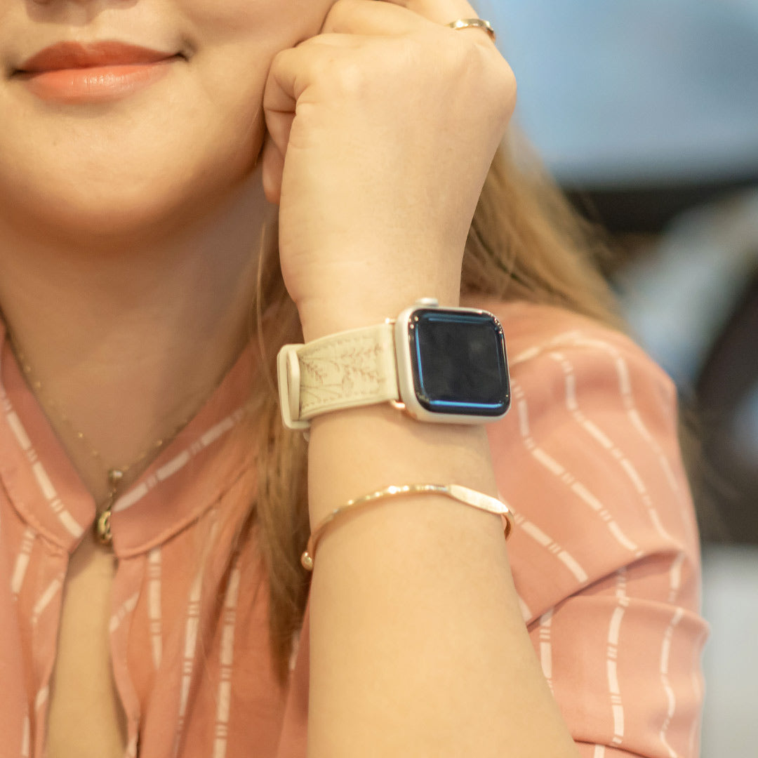 With engraved gold floral patterns that catch the light beautifully, this band adds soft elegance to your Apple Watch while offering the comfort and flexibility of high-quality silicone.